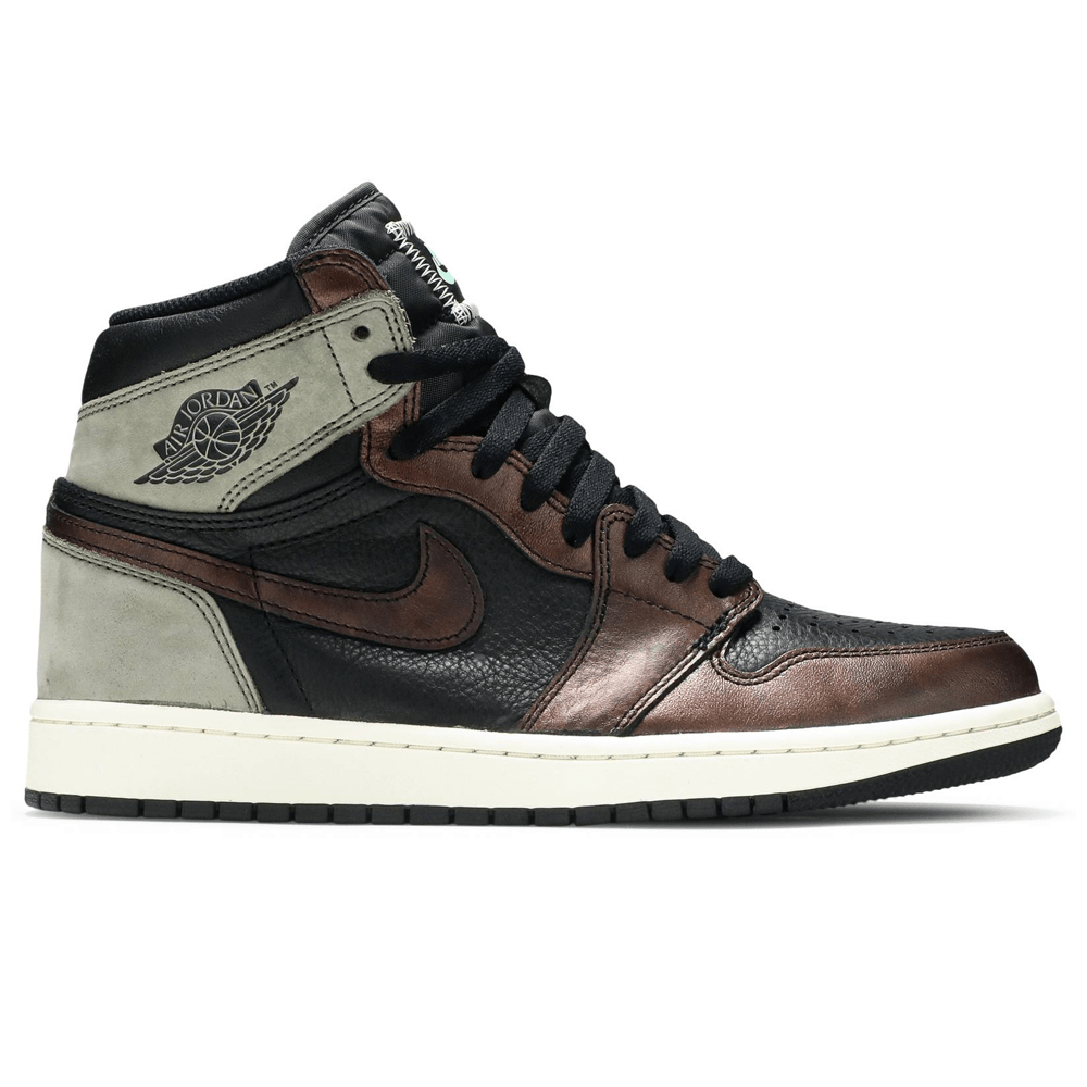 The Air Jordan 1 Retro High OG ‘Patina’ treats the iconic sneaker to an aged aesthetic, highlighted by a distressed bronze finish on the forefoot overlay, Swoosh and eyestay. The rest of the upper is constructed from black tumbled leather and grey nubuck on the heel and collar overlay. Atop the black nylon tongue, the woven logo tag is surrounded by zigzag stitching and marked with ‘Nike Air’ in a contrasting pop of mint green. The high-top is mounted on an off-white midsole that amplifies the sneaker’s vintage look and feel.