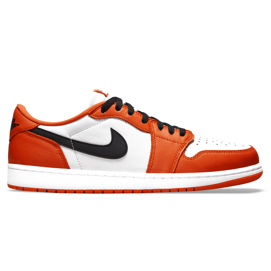 The Air Jordan 1 Low OG ‘Starfish’ features a familiar color combination that recalls the brand’s ‘Shattered Backboard’ series. The low-top carries an all-leather upper that pairs a crisp white base with contrasting orange overlays at the forefoot, heel and eyestay. Contrasting black hits land on the Swoosh, laces and Jordan Wings logo stamped on the heel tab. Nike Air branding decorates the sockliner and woven tongue tag. The sneaker is mounted on a rubber cupsole with encapsulated Air sole cushioning in the heel.