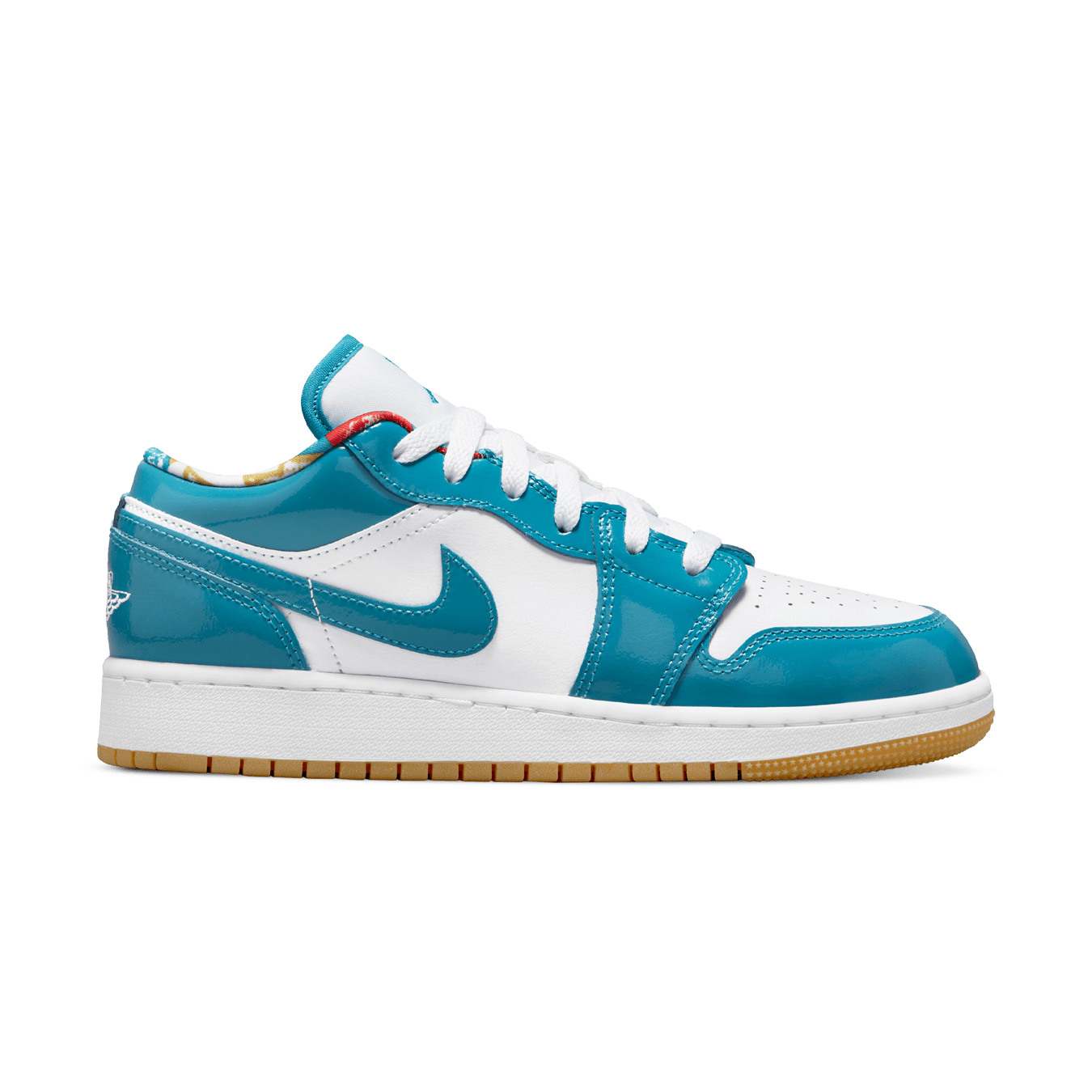 The Air Jordan 1 Low SE GS 'Barcelona' indulges in a vibrant, summer-ready ensemble. White smooth leather sets the stage for patent leather overlays dipped in a punchy and glossy blue tone. And while eye-catching in their own right, these panels arguably play a supporting role to the geometric, mismatched patterns that line each shoe’s collar. Inspired by a particular sweater Michael Jordan wore off-court during his time in Barcelona for the 1992 Olympics, the print has previously appeared on a number of Jordans. Underfoot, the low-top Air Jordan 1 abandons any bold hue in favor of a light gum brown outsole that makes a statement of its own.