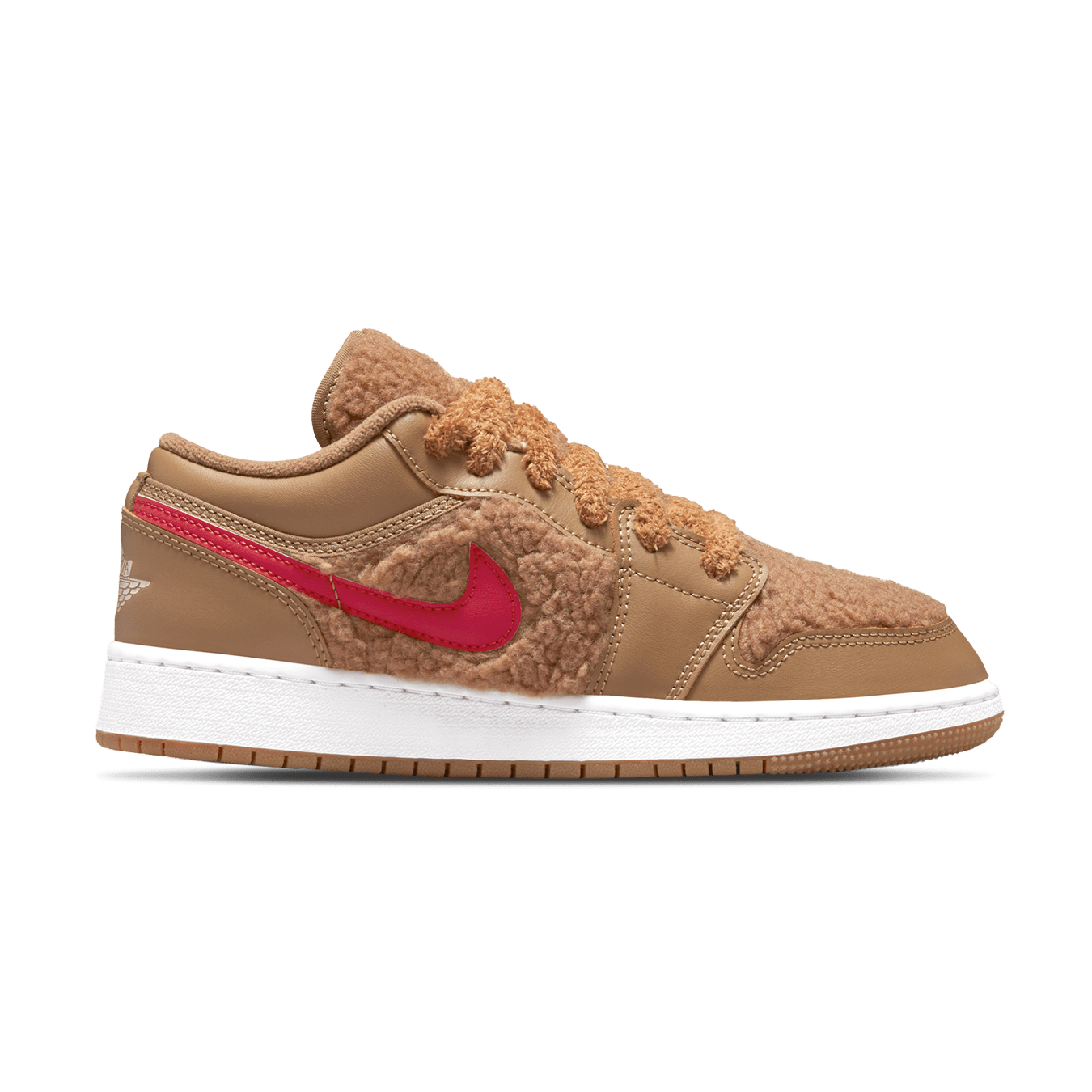 The kids are getting a friendly “Teddy Bear” edition of the popular Air Jordan 1 Low designed to keep their little feet warm during the winter months. Dressed in a Dark Driftwood, Pink Salt, Gym Red, and Racer Blue coloir scheme. This low-top Air Jordan 1 features an upper constructed with cozy fleece (and a plush fleece-lined collar). Additional details includes fuzzy laces and tongue to give off that wintry vibe, while having mismatched Swooshes and insoles atop a White midsole and Gum rubber outsole.