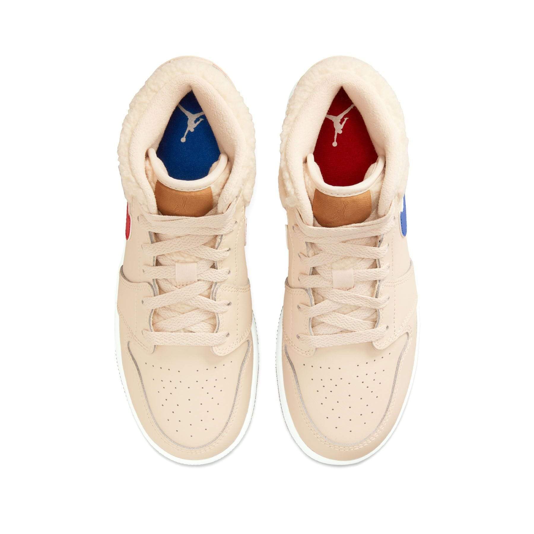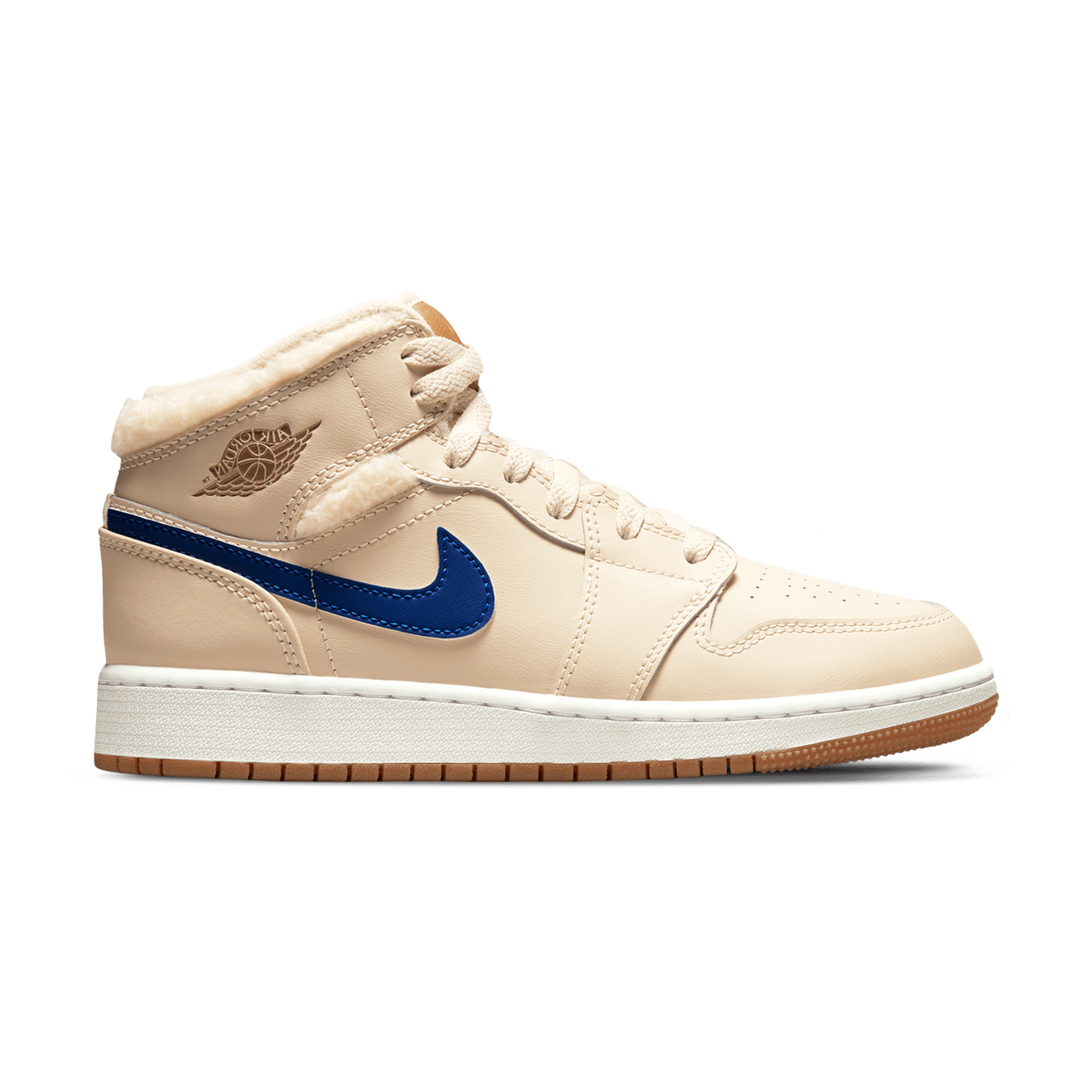 Built for big kids, the Air Jordan 1 Mid Utility GS 'Fleece’ showcases asymmetrical branding on an insulated build made for the cold-weather months. The beige leather upper is lined in soft textile and features fluffy fleece construction around the mid-cut collar and along the top of the tongue, the latter accented with a Jumpman-debossed leather tag. Mismatched Swooshes in navy and lime green decorate the left shoe, while the right shoe features contrasting Swooshes in coral and crimson. Underfoot, a gum rubber outsole offers grippy traction.
