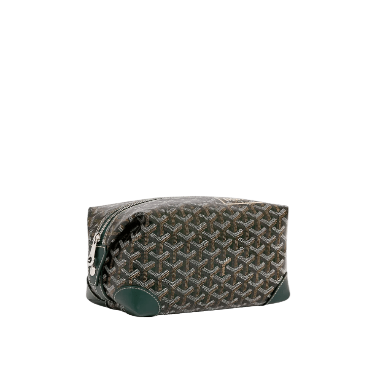 The Goyard Bowling 25 Toiletry Bag Dark Green blends classic design with luxury functionality. Perfect for travel or daily essentials, it’s made from Goyardine coated canvas and features leather handles and silver hardware.