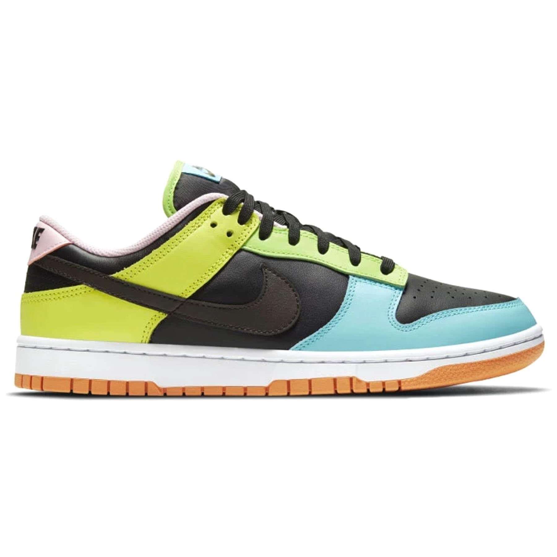 The Nike Dunk Low SE GS ‘Free.99 - Black’ applies mismatched colour blocking to the vintage hoops shoe turned streetwear staple. Both the left and right shoe feature a black leather base on the upper, supported by a crisp white midsole and pale orange rubber outsole. While the overlays on each shoe are arranged in asymmetrical fashion, they draw from the pastel palette of powder blue, pink, yellow and line green hues. The custom sockliner displays ‘Free.99’ price stickers.